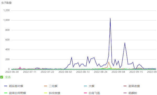 2022年8月末,受台风“轩岚诺”影响,杭州市余杭区出现持续大风和高湿天气,托普云农智能虫情测报灯有效监测到稻纵卷叶螟及二化螟蛾峰,当地农业农村局根据虫害发生态势,立即开展分品种、分区块普查,结合系统调查结果,掌握防治适期,科学用药,杜绝滥用药。