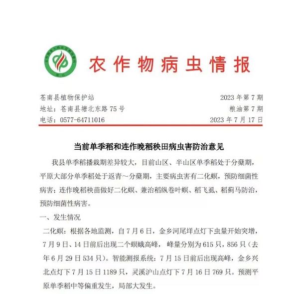 在浙江温州,2023年7月,托普云农智能虫情测报灯监测到二化螟高峰,苍南县植物保护站随即发布农作物病虫情报,预测平原单季稻中等偏重发生,局部大发生,加强防范。